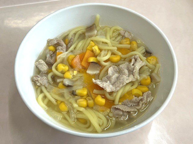 味をととのえ、中華麺とコーンを入れて仕上げる