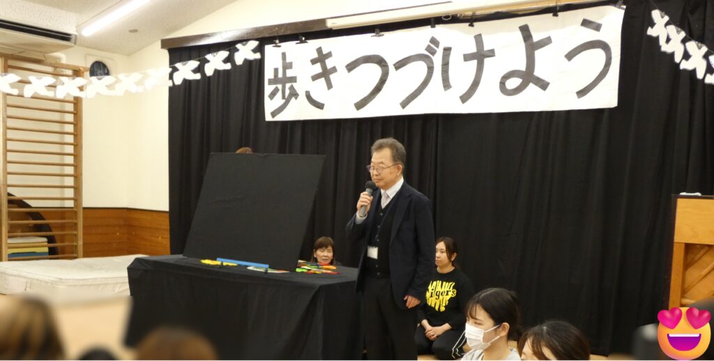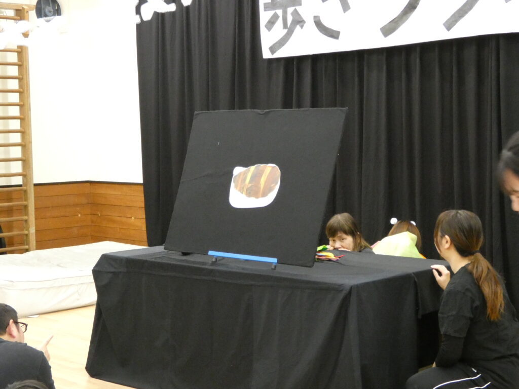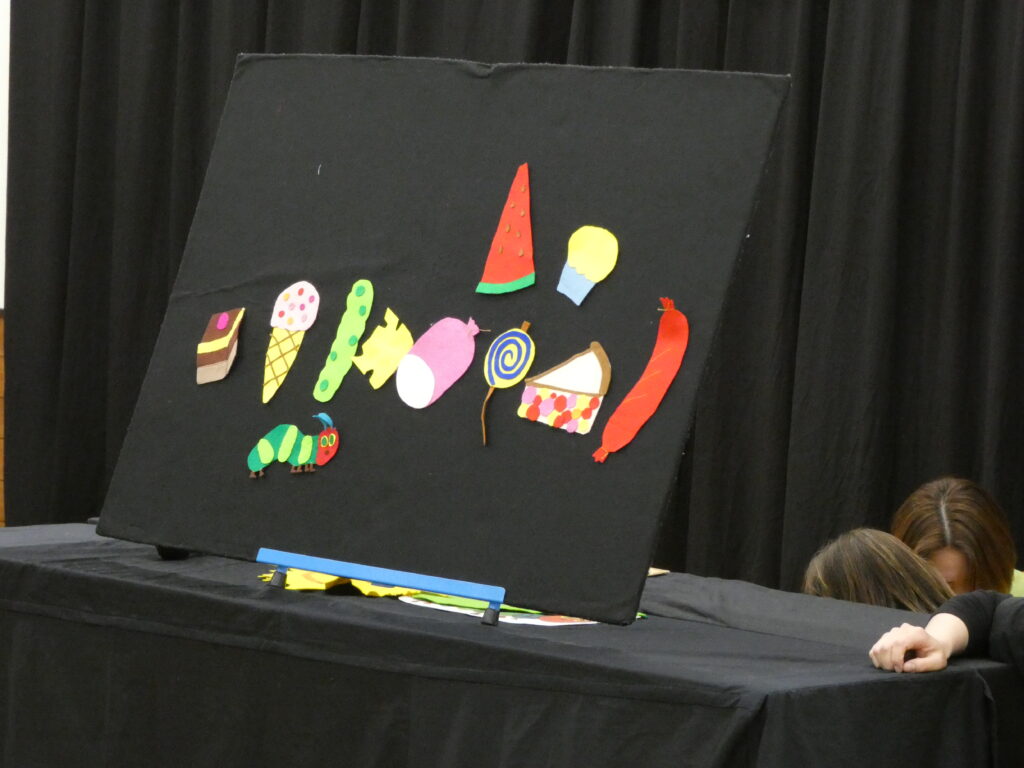 始業式では、職員からの出し物で『はらぺこあおむし』のペープサートがありました。